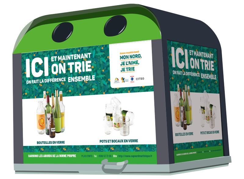 Borne de tri verte : Les bouteilles, pots et bocaux de verre